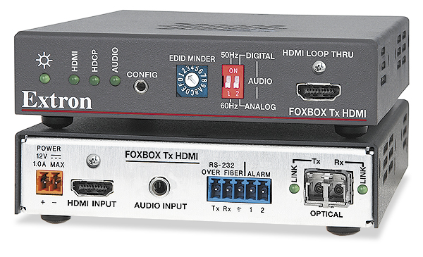 The Extron FOXBOX Tx HDMI Fiber Optic Extender is a transmitter for long haul transmission of HDCP-compliant HDMI video, stereo audio, and RS-232 control signals over fiber optic cabling. Engineered for reliability and exceptional high resolution image performance, it uses Extron all-digital technology to deliver perfect pixel-for-pixel transmission of HDMI computer-video images up to WUXGA 1920x1200 resolution, including HDTV 1080p/60. Designed specifically for AV systems, the FOXBOX Tx HDMI also includes many integrator-friendly features such as Key Minder®, EDID Minder®, audio embedding, and real-time system monitoring. A compact, low profile enclosure allows for discreet installation.The FOXBOX Tx HDMI is part of the extensive FOX Series of fiber optic products from Extron and is compatible with FOX Series HDMI, DVI Plus, DVI, and VGA receivers. The FOXBOX Tx HDMI transmitter can be used for simple point-to-point applications or in combination with FOX Series matrix switchers for support of wider installations.