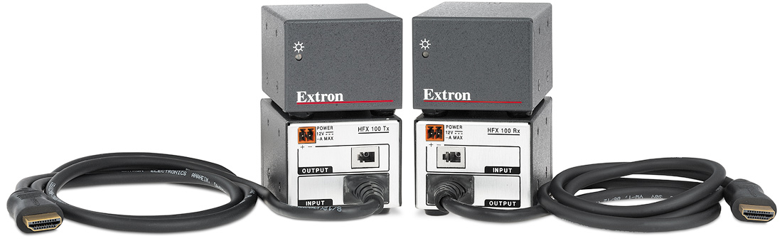 The Extron HFX 100 Fiber Optic Extender is a compact transmitter and receiver set that provides extension of HDCP-compliant HDMI signals long distances over one fiber optic cable. It supports HDMI specification features including data rates up to 6.25 Gbps, 12-bit Deep Color, HD lossless audio formats, and CEC. Engineered for reliability and exceptional high resolution image performance, it uses all-digital technology to deliver perfect pixel-for-pixel transmission of images up to 1920x1200, including HDTV 1080p/60 and 2K. The HFX 100 extends HDMI video and embedded multi-channel digital audio signals over a multimode fiber optic cable at lengths up to 300 meters (984 feet).The transmitter and receiver are housed in 1U high, one eighth rack width enclosures for convenient, discreet installation. To simplify integration, attached ultra-flexible HDMI cables allow for direct connection to source and display. The transmitter and receiver feature industry standard LC-type connectivity for fiber connection. Pre-terminated multimode fiber optic cable assemblies from Extron are available in a variety of lengths from one meter (3.3 feet) to 60 meters (197 feet).The HFX 100 is ideal for a wide range of applications requiring long distance transmission of high resolution content with the highest quality. Because transmission of content is inherently secure and immune to outside interference, fiber applications are favored in government, military, and medical environments.
