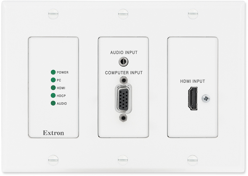 * Auto-switching between inputs — Auto-switching allows for simple, unmanaged installation in locations such as in a lectern or floor box. When multiple inputs are active, the switching priority is configurable.