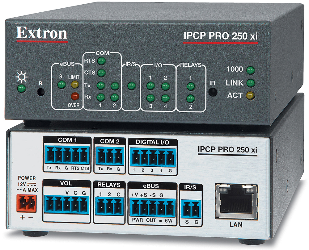 The Extron IPCP Pro 250 xi is a versatile, high-performance control processor designed for centralized AV control in small to medium-size applications. It features enhanced performance with greater processing power and twice the memory of our previous IP Link Pro series. The IPCP Pro 250 xi also features advanced security standards and Gigabit Ethernet, which ensures compatibility with multiple TouchLink® Pro touchpanels and Network Button Panels using a standard network infrastructure. The IPCP Pro 250 xi is an ideal choice for controlling multiple devices and control signal types within an AV system.