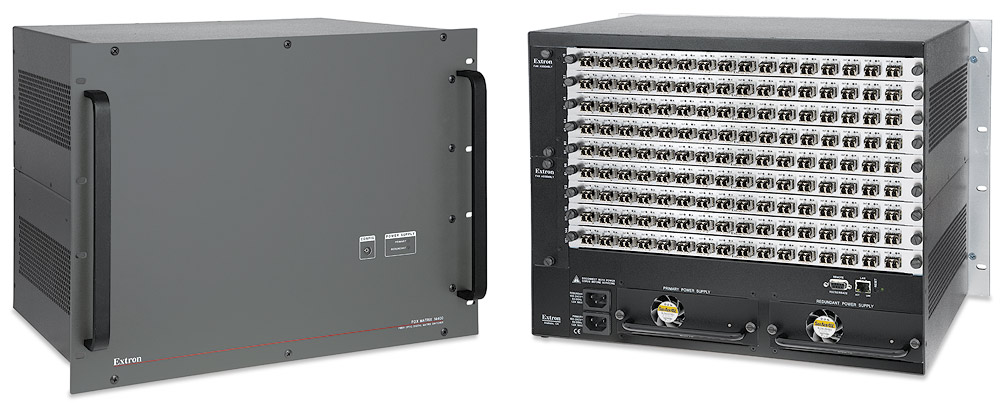 The Extron FOX Matrix 14400 is a high performance, modular fiber optic matrix switcher for complete, end-to-end digital AV signal transmission and routing over fiber optic cable. The matrix switcher is expandable from 16x16 to 144x144, and is fully compatible with FOX Series transmitters and receivers. Supporting video resolutions up to 4K, it features very high speed, all‑digital switching of DisplayPort, HDMI, DVI, 3G-SDI, RGB, HD component, and standard definition video. Equipped with integration-friendly features common to Extron matrix switchers, together with hot-swappable I/O boards and fan, real-time system monitoring, and redundant, hot-swappable power supplies, the FOX Matrix 14400 delivers highly reliable, enterprise-wide switching of fiber optic AV and control signals for mission-critical environments.