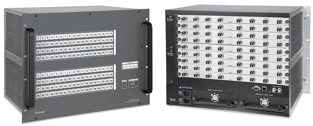 The Extron FOX Matrix 7200 is a high performance, modular fiber optic matrix switcher for complete, end-to-end digital AV signal transmission and routing over fiber optic cable. The matrix switcher is expandable from 8x8 up to 72x72, and is fully compatible with FOX Series transmitters and receivers. Supporting video resolutions up to 4K, it features very high speed, all‑digital switching of DisplayPort, HDMI, DVI, 3G‑SDI, RGB, HD component, and standard definition video. Equipped with the integration-friendly features common to Extron matrix switchers, together with hot-swappable I/O boards and fan, real-time system monitoring, and redundant, hot-swappable power supplies, the FOX Matrix 7200 delivers highly reliable, enterprise-wide switching of fiber optic AV and control signals for mission-critical environments.