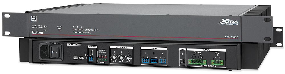 XPA 2003C-100V - 2 x 200 watts @ 4 ohms or 2 x 100 watts @ 8 ohms, and 1 x 200 watts @ 100 volts — The unique XPA 2003C is designed to support both speech reinforcement over distributed speaker systems and stereo material through program speakers.