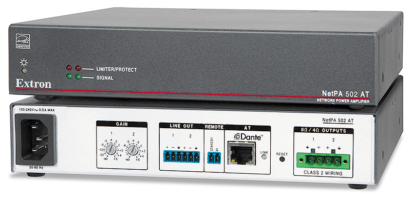 * Receives input signals via the Dante™ audio network — Select two channels from any remote Dante-enabled device on the network to be brought into the NetPA 502 AT for amplification.