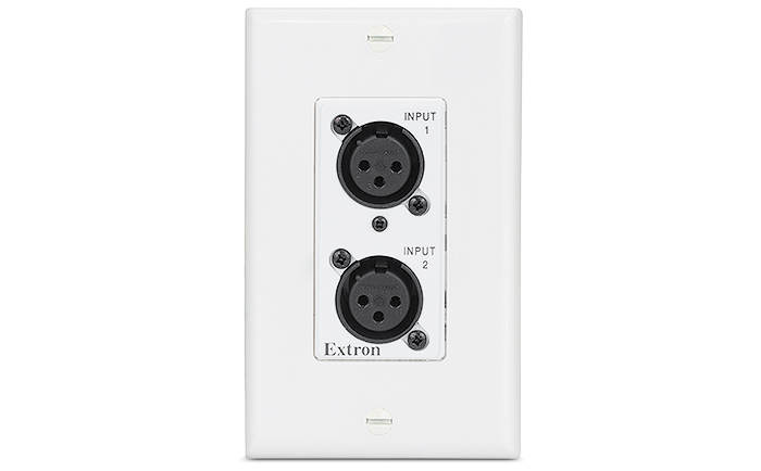 * Two line outputs on a rear panel captive screw connector receive audio from a Dante network — Two line outputs are located on the back, and can be used for routing any two audio channels from the Dante network to an amplifier, or connecting into an optional secondary Extron wallplate with two XLR or RCA outputs. The XLR outputs are ideal for recording, or an ALS - assistive listening system.
