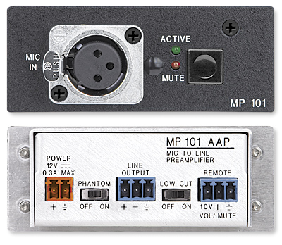 The MP 101's output can be remotely controlled for microphone level adjustment by using the VCM 100 or VCM 200 Series volume and mute or VC 50 volume controllers. The MP 101 is housed in a 1U, one-eighth rack width metal enclosure for numerous installation options.