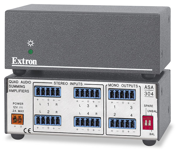 The Extron ASA 304 is a high performance Audio Summing Amplifier that converts two-channel stereo audio signals to balanced or unbalanced mono audio signals. It is ideal for summing stereo signals for use in mono multi-speaker PA systems in churches, halls, arenas, stadiums, and other environments where stereo signals would result in cancellation.The ASA 304 offers four independent, active audio summing amplifiers in a single enclosure. It converts stereo audio signals from four different sources to mono audio signals and includes switch-selectable gain to achieve different output gain levels. The ASA 304 accepts balanced or unbalanced stereo input signals on captive screw connectors and provides balanced/unbalanced outputs on captive screw connectors. This high performance summing amplifier enables long cable runs and immunity from interference and noise normally associated with the use of unbalanced audio equipment in professional integration projects.The ASA 304 is housed in a 1U, quarter rack width metal enclosure, is easy to install in small spaces, and is rack and under-desk mountable. It can also be mounted at the projector using the Extron series of PMK - Projector Mounting Kit products.