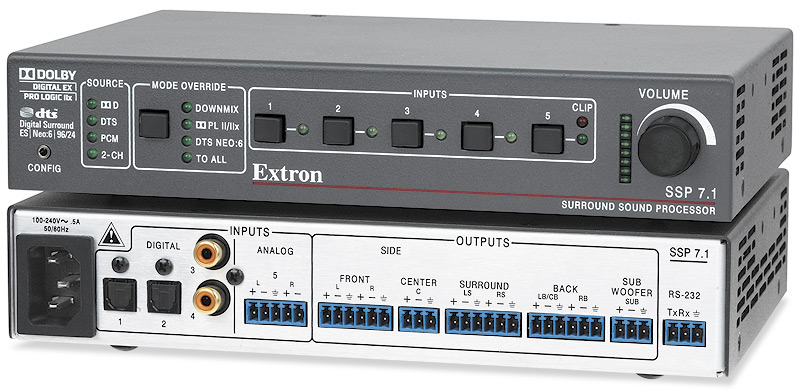 The Extron SSP 7.1 five input Surround Sound Processor provides up to eight channels of surround sound for pro AV applications in corporate and commercial environments. The SSP 7.1 automatically detects and decodes audio content in various Dolby® and DTS® formats from DVD, Blu-ray Disc, and HDTV broadcasts. It also offers Dolby Pro Logic II/IIx and DTS Neo:6® processing to provide surround sound from two-channel stereo. The SSP 7.1 features coaxial and optical digital inputs, plus an analog balanced/unbalanced two-channel input. It is designed for integration into pro AV installations, with a compact, rack-mountable metal enclosure, RS-232 serial control, and balanced/unbalanced line level outputs. The included control software offers a user-friendly GUI for setup and operation.The SSP 7.1 is designed for simple, intuitive operation from the front panel, with LED indicators for source selection, source format detection, listening mode override, and output volume level. At the touch of a button, the user can override the current surround sound output and switch to a different listening mode, for example, from 5.1 channel Dolby Digital to two-channel downmixed stereo, or from two-channel stereo to 7.1 channels via Dolby Pro Logic IIx. The user also has the option to send stereo audio to all left and right speakers without surround sound processing.