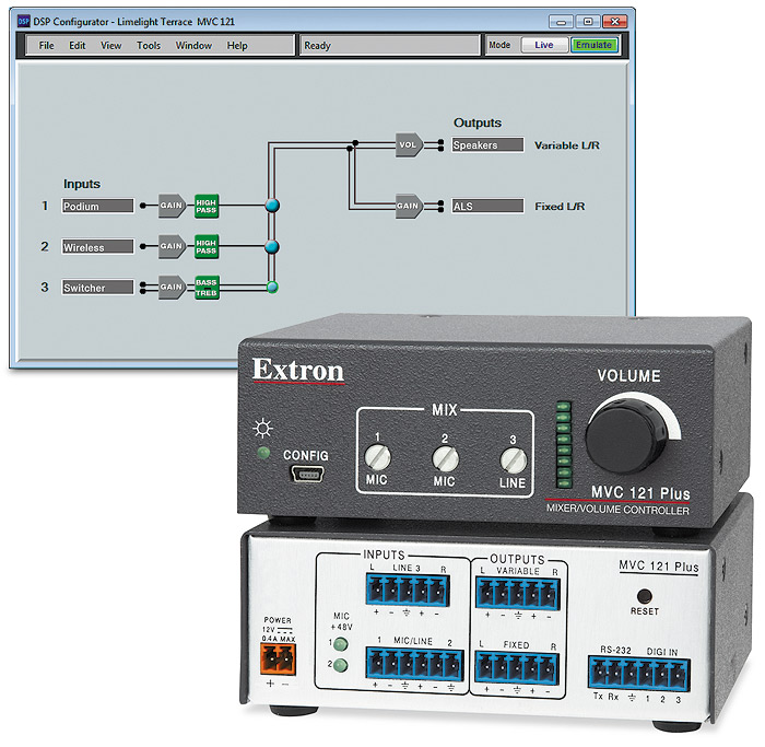 The Extron MVC 121 Plus is a compact, three input stereo audio mixer featuring a digital signal processing platform for audio signal mixing and control. The MVC 121 Plus features a stereo line level input and two mic/line level inputs with 48 volt phantom power for condenser microphones, plus fixed and variable stereo line level outputs. It offers gain, filter, tone processing, and parametric EQ. Quick and intuitive configuration using the DSP Configurator™ Software allows the MVC 121 Plus to be installed in very little time. The MVC 121 Plus is ideal for presentation applications that require line and microphone audio mixing with DSP in a small form factor.